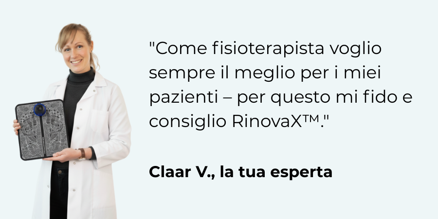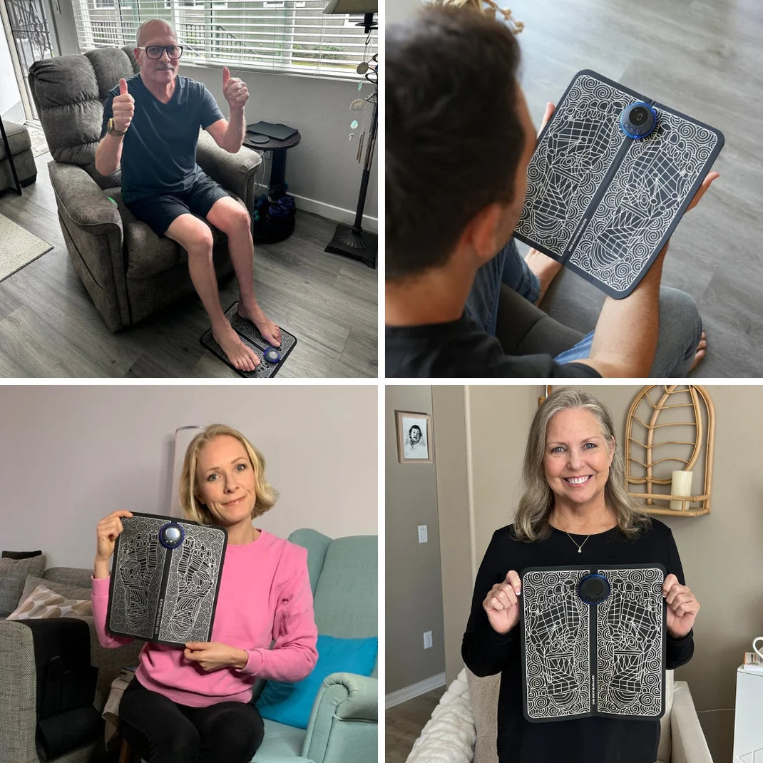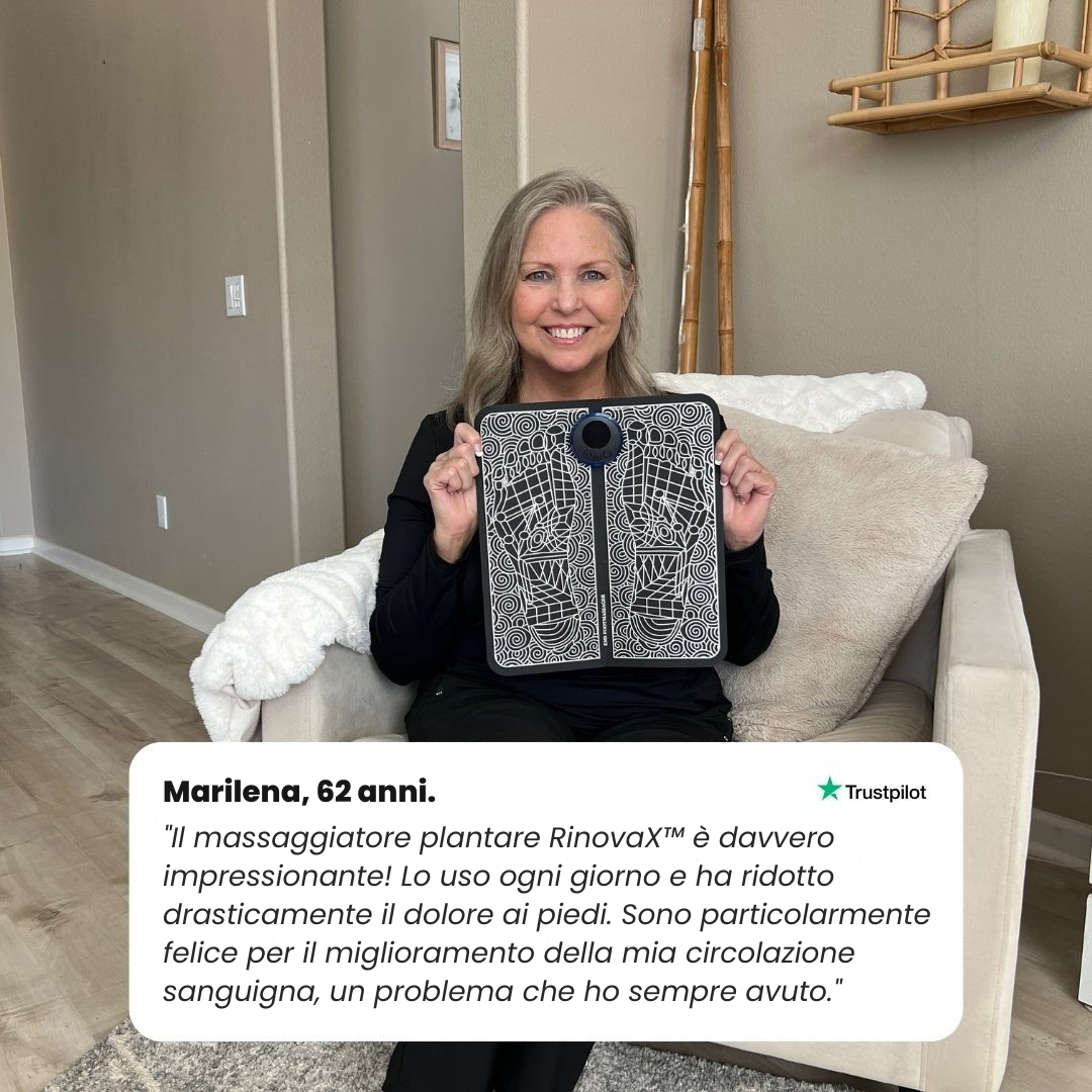 RinovaX™ elektrisk fotmassageapparat stimulerar blodcirkulationen med riktade pulser genom fotsulorna . Detta återaktiverar cirkulationen och gör att dina ben och fötter känns lätta och avslappnade igen.